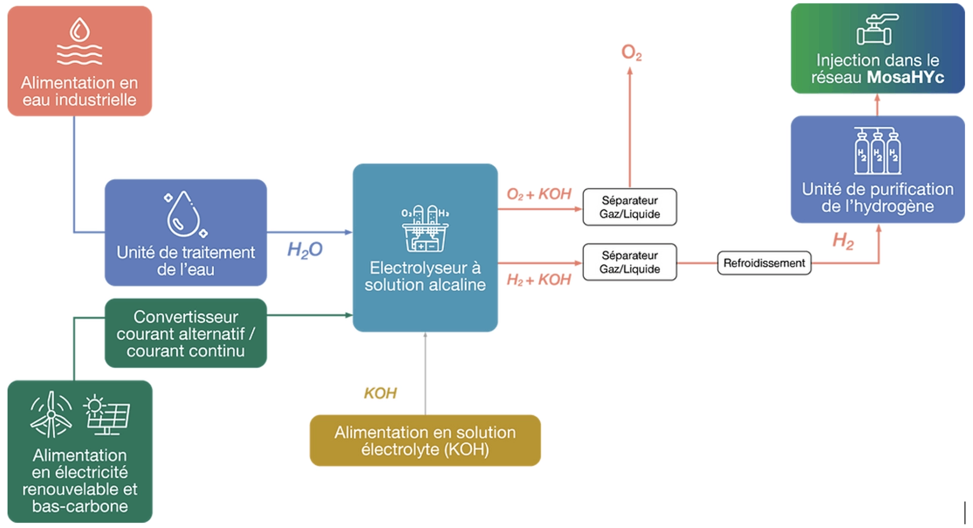 La conception technique du projet Emil’Hy a été réalisée sur la base de la technologie de l’électrolyse alcaline. Il s’agit d’une méthode de production d’hydrogène qui consiste à séparer l’oxygène (O) et l’hydrogène (H2) de l’eau (H2O) en faisant passer un courant électrique dans une solution alcaline.